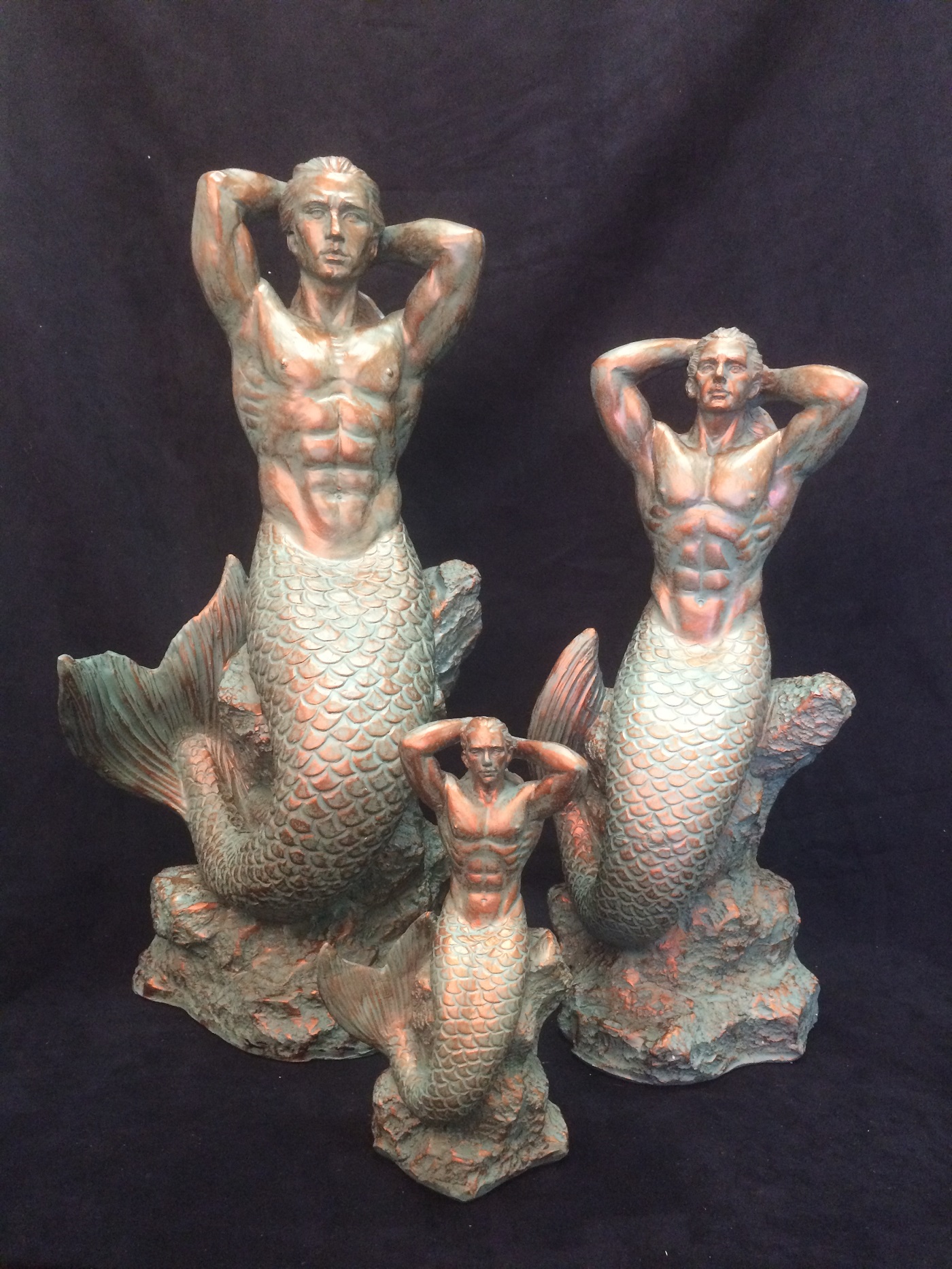 Triton Merman Sitting on Rock 15" Patina